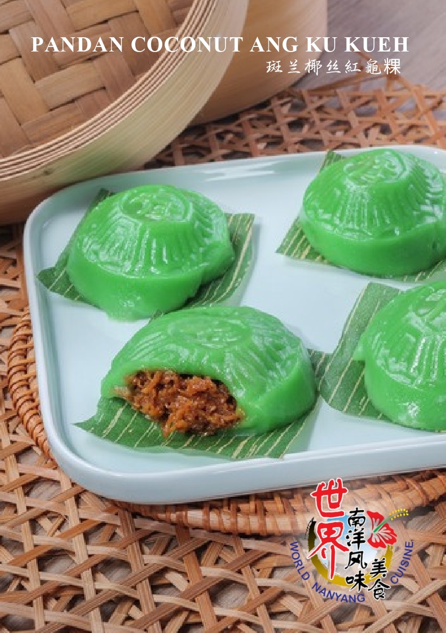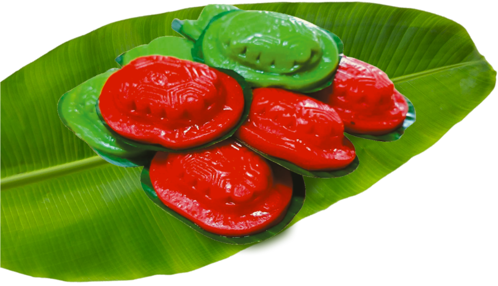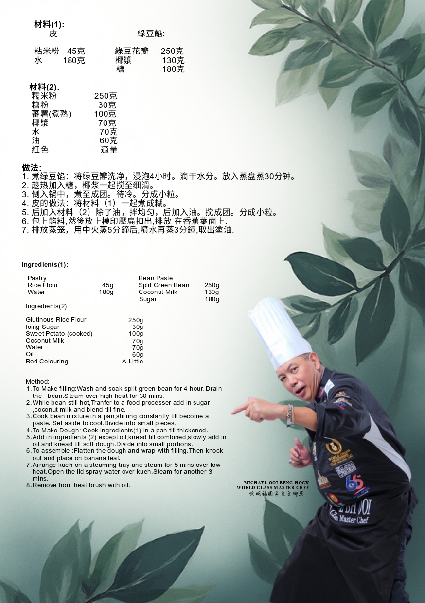 组装:将面团压平,包入馅料,将其捏合成球状,轻轻压平,然后放入模具中,用力按压,使其成型,最后将其敲出并放在香蕉叶上。