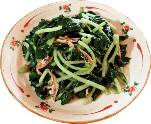 在炒锅中加热3汤匙的油。稍微炒香几片鱼仔,然后加入切碎的大蒜炒至香味出来。加入蔬菜和调味料,快速翻炒后即可起锅。